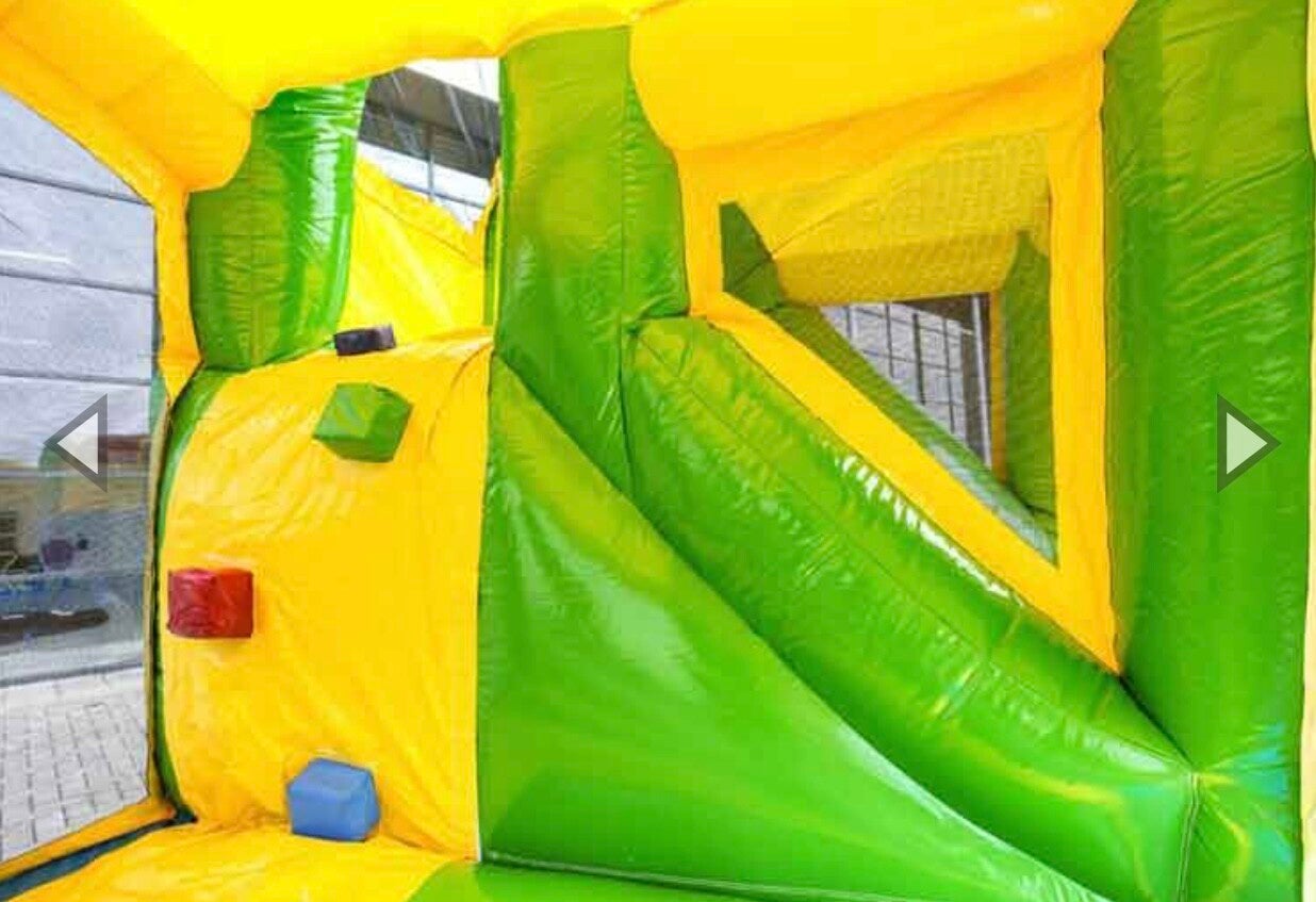 Aan de zijkant van dit springkussen zit een leuke glijbaan, zodat de kinderen binnenin lekker kunnen springen en er via de glijbaan uit kunnen glijden. Ideaal voor een kinderverjaardag.